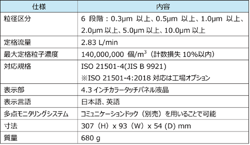 新たにリリースしたKC-52A は、ハンディタイプの気中パーティクルカウンタである。図1はKC-52A の外観である。KC-52A は従来製品と同様に、光散乱式気中粒子計数器の必要要件を定めたJIS B 9921:2010 およびISO 21501-4(ISO 21501-4:2018/Amd:2023 仕様の校正は工場オプション)に対応している。表1は基本製品仕様である。測定可能な最小粒径は従来機種と同様の0.3 μm である。測定可能な粒径区分に10.0 μm 以上のレンジを追加した。本体にバッテリを搭載し、満充電状態で約7 時間以上の連続測定動作が可能である。
