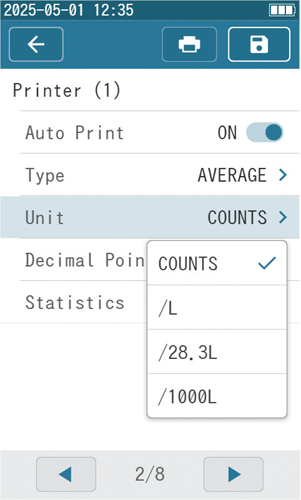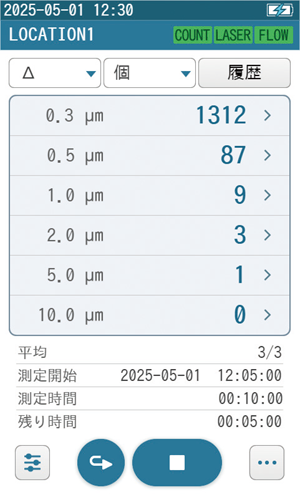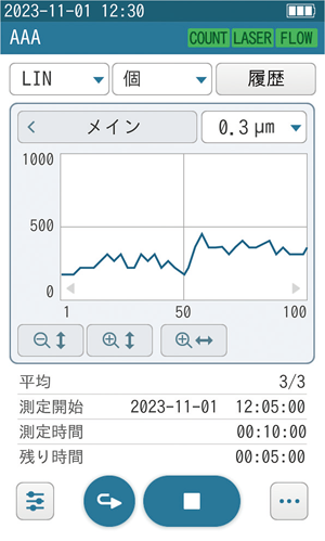 グラフのプロット表示は線形表示、対数表示から選択できる。空気中の粒子数が数個のようなクリーンな環境で使用する場合、対数表示させることで計数値の変化の確認が容易になる。他にも対数表示は急激に計数値が増加または減少する場合にも有効である。縦軸の最大値は複数のパターンから、表示させる粒径は画面右上のプルダウンから選択する。