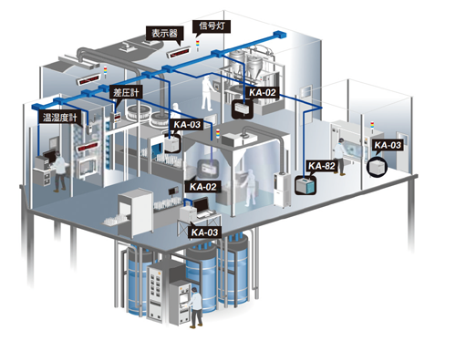 - ドックと多点監視ソフトウェアRP モニタ Evo10(別売)を用いることで当社独自の多点モニタリングシステムを構築できる。測定したい管理ポイント毎にパーティクルカウンタを設置して、遠距離から制御することで、各測定点の同時測定が可能である。(図5参照)